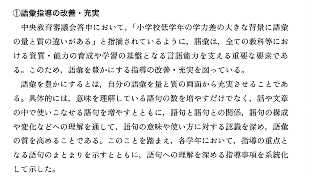 中央教育審議会(平成28年)答申には「語彙指導の改善・充実」として次のように書かれています。