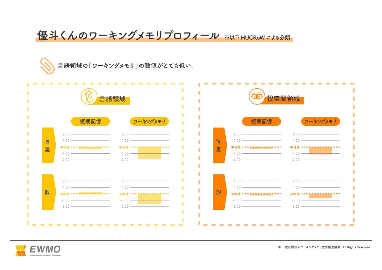優斗くんの結果を見ると、言語領域の「ワーキングメモリ」の数値がとても低く出ました。単純な記憶はできても、「覚えながら考える」ことが苦手です。