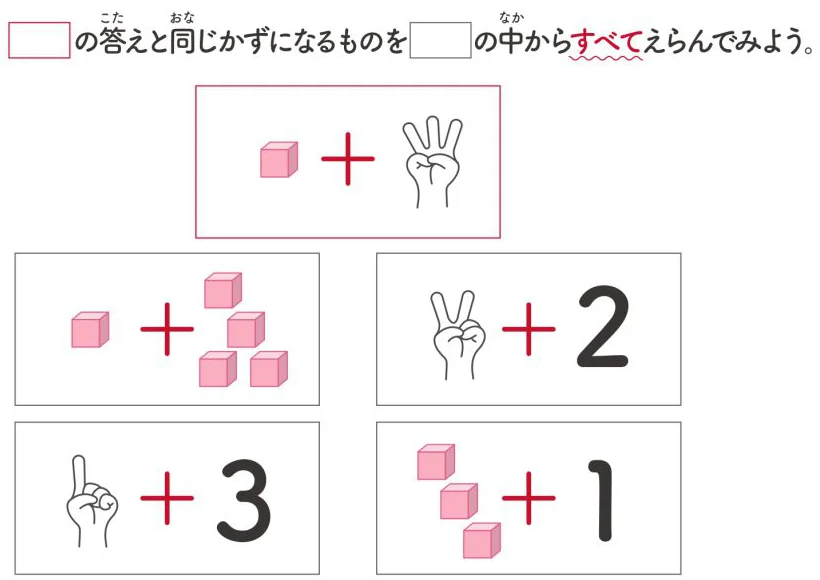 また「数操作」は、次のような問題です。「数操作」は、「物や数字を使って計算する力」であり、就学前の段階でこの力を育てることが、小学校の計算や文章題理解の土台になります。