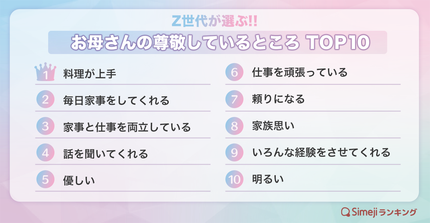 バイドゥ株式会社が、きせかえ顔文字キーボードアプリ「Simeji」ユーザーアンケート「Z世代が選ぶ!!お母さんの尊敬しているところ」を発表しました。