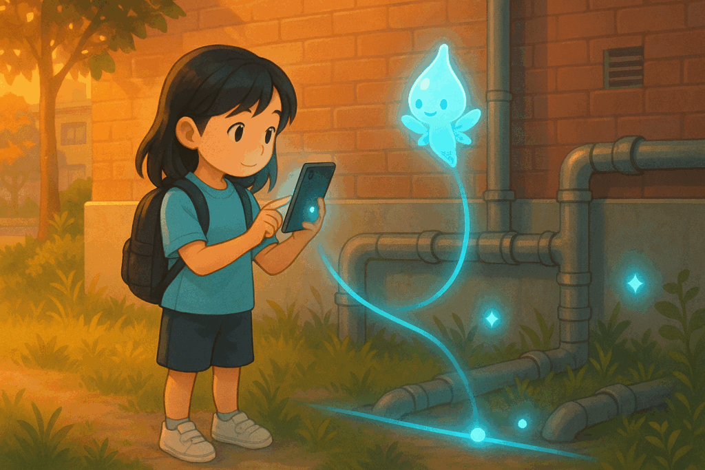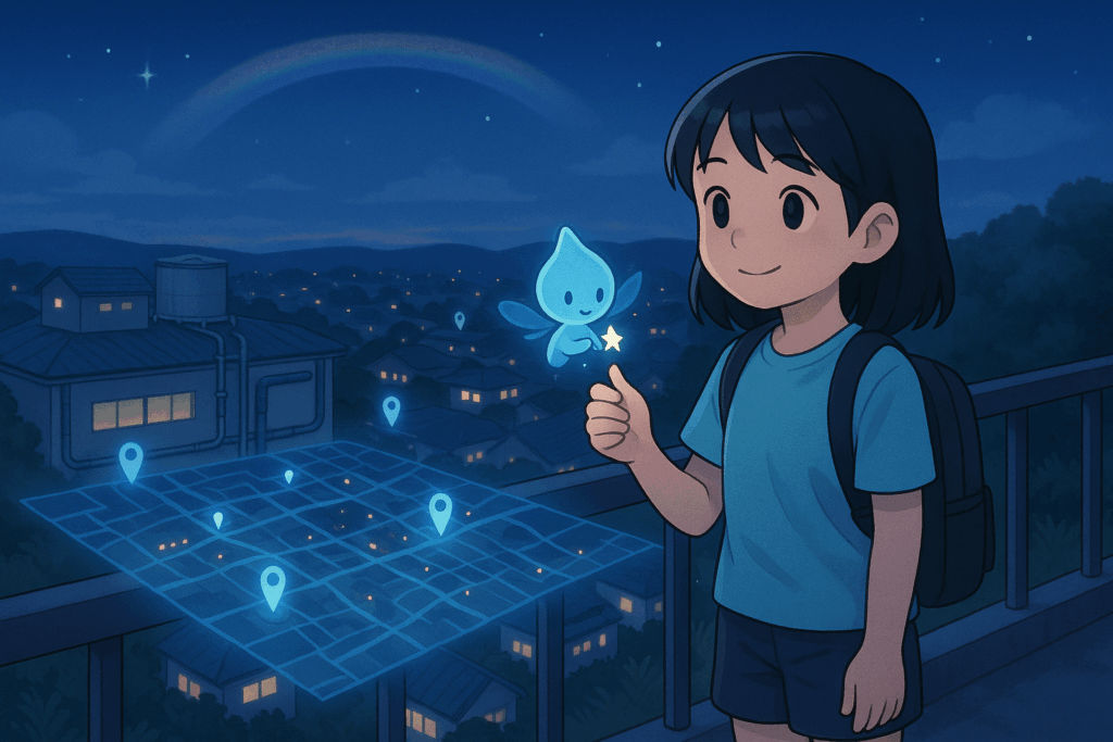 六年生のミナは、友だちと作ったアプリ「MizuMap」で町の水の流れをAR表示し、もれを見つけては地図にピンを立てていた。