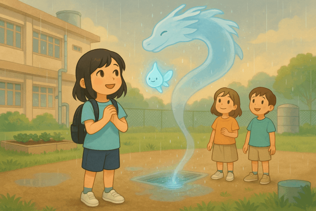 ある夜、アプリの“手洗いゲージ”が満タンになった瞬間、校庭のスプリンクラーから細いミストが上がり、小さな雨の竜が姿を見せた。竜は雲を連れてきて、畑と貯水槽をやさしくうるおした。翌朝、欠席は減り、汲み出しに使っていた時間は読書と遊びの時間に変わった。