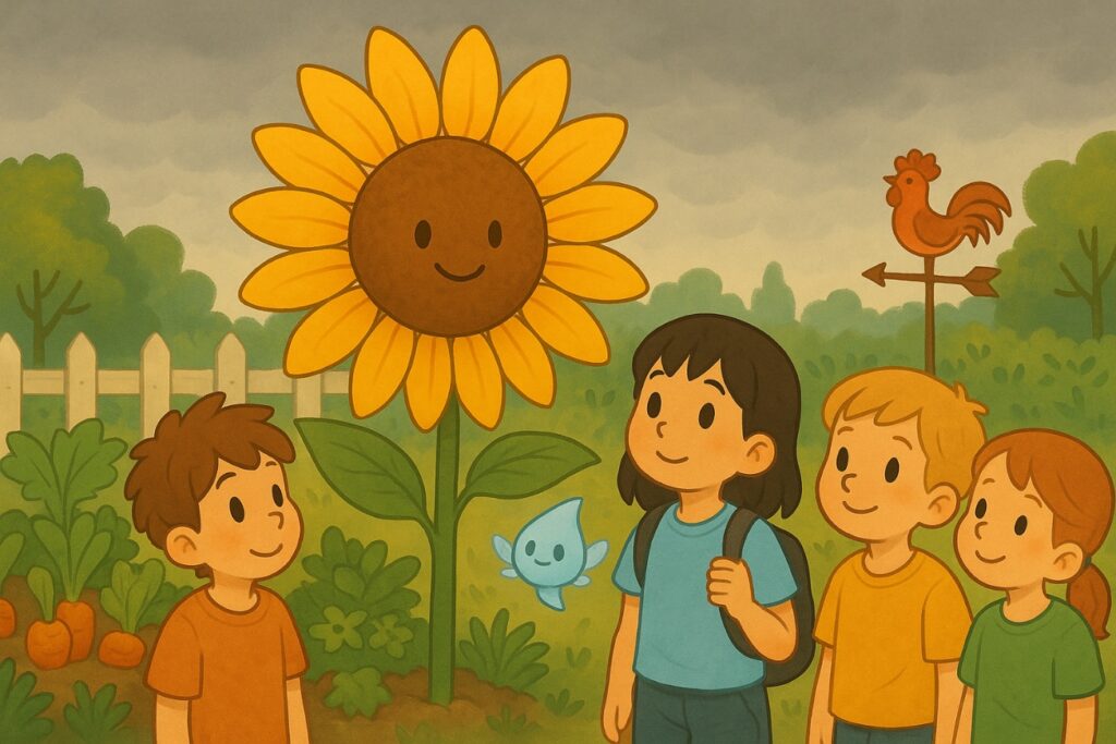 「太陽さん、どうしたの?」サニーがつぶやくと、風見鶏がカタカタと鳴り、庭の仲間が集まりました。