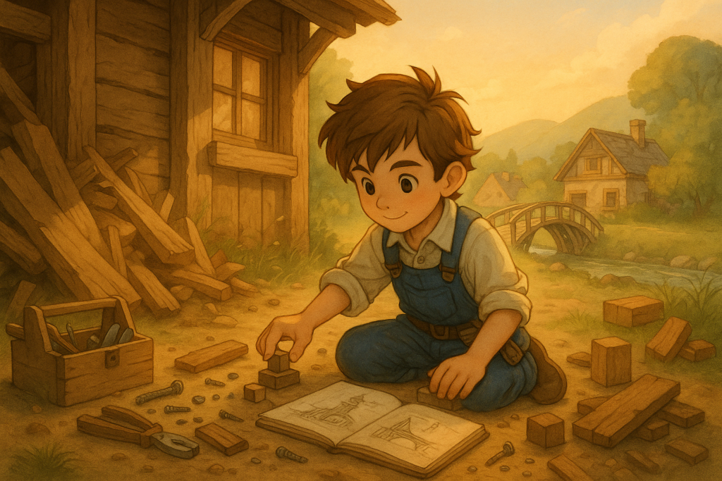 古いネジを見つければポケットにしまい、壊れた棚板を見つければ机に、余った段ボールは屋根に変えてしまう。