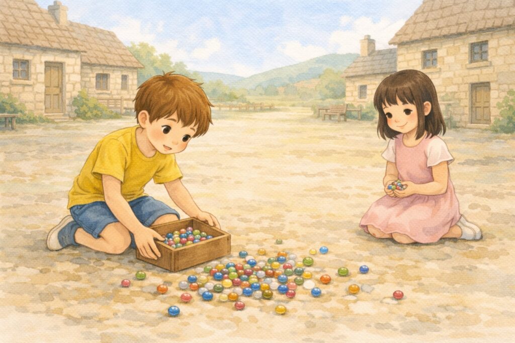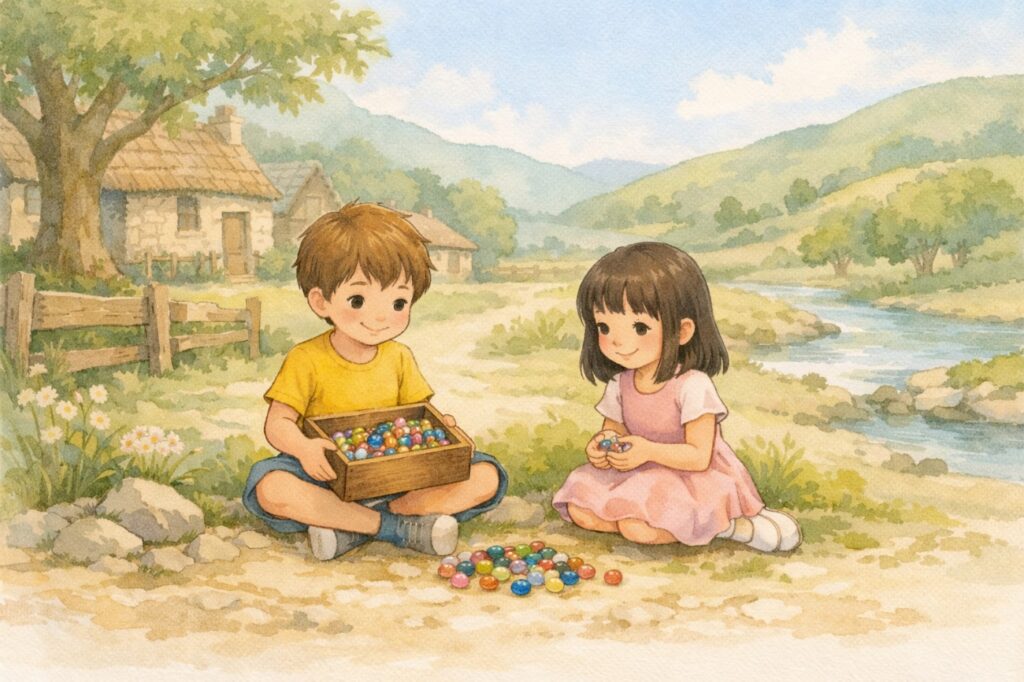 それからというもの、二人はビー玉だけでなく、時間も、遊びも、気持ちも、分け合うようになりました。