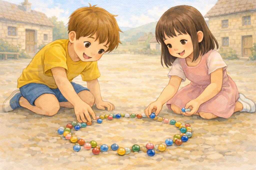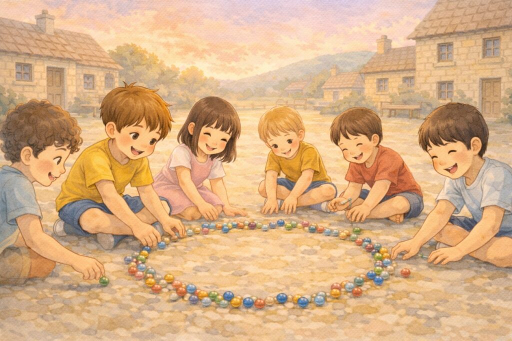 色のちがうビー玉が混ざり合うたびに、新しい遊びが生まれ、笑い声が広場に広がっていきました。