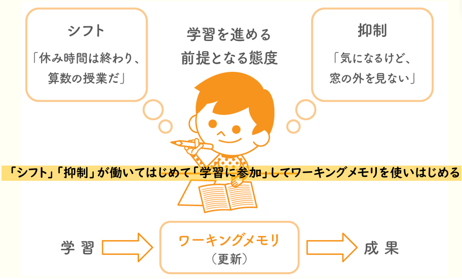 一般社団法人ワーキングメモリ教育推進協会では、「参加」について、上の図で解説しています。「切り替え」と「抑制」ができて、はじめて学習に「参加」することができます。先生方が教育の現場で感じる「違和感」の正体は、この「参加」にあります。つまり、「切り替え」と「抑制」ができない、または十分でない子どもたちがいる、ということです。
